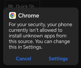 Toggle on "Install unknown apps" or "Unknown sources". You can disable it after